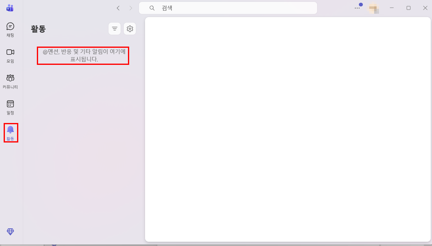 [활동] 메뉴는 알림창과 같은 역할을 하며, 멘션, 반응, 기타 알림이 모두 이곳에 표시됩니다.