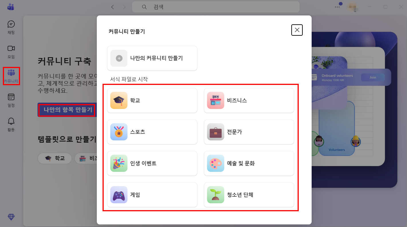 [커뮤니티] 메뉴에서는 각 상황에 맞는 커뮤니티를 선택하여 자신만의 커뮤니티를 시작할 수 있습니다.