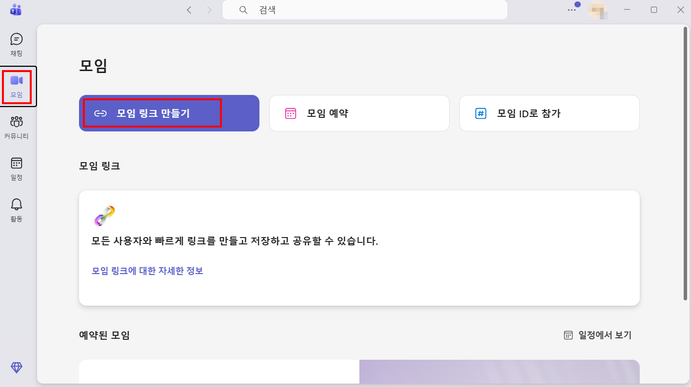 [모임] 메뉴에서 모임 링크 만들기 버튼을 누르면 회의 참여 링크가 자동으로 생성됩니다.