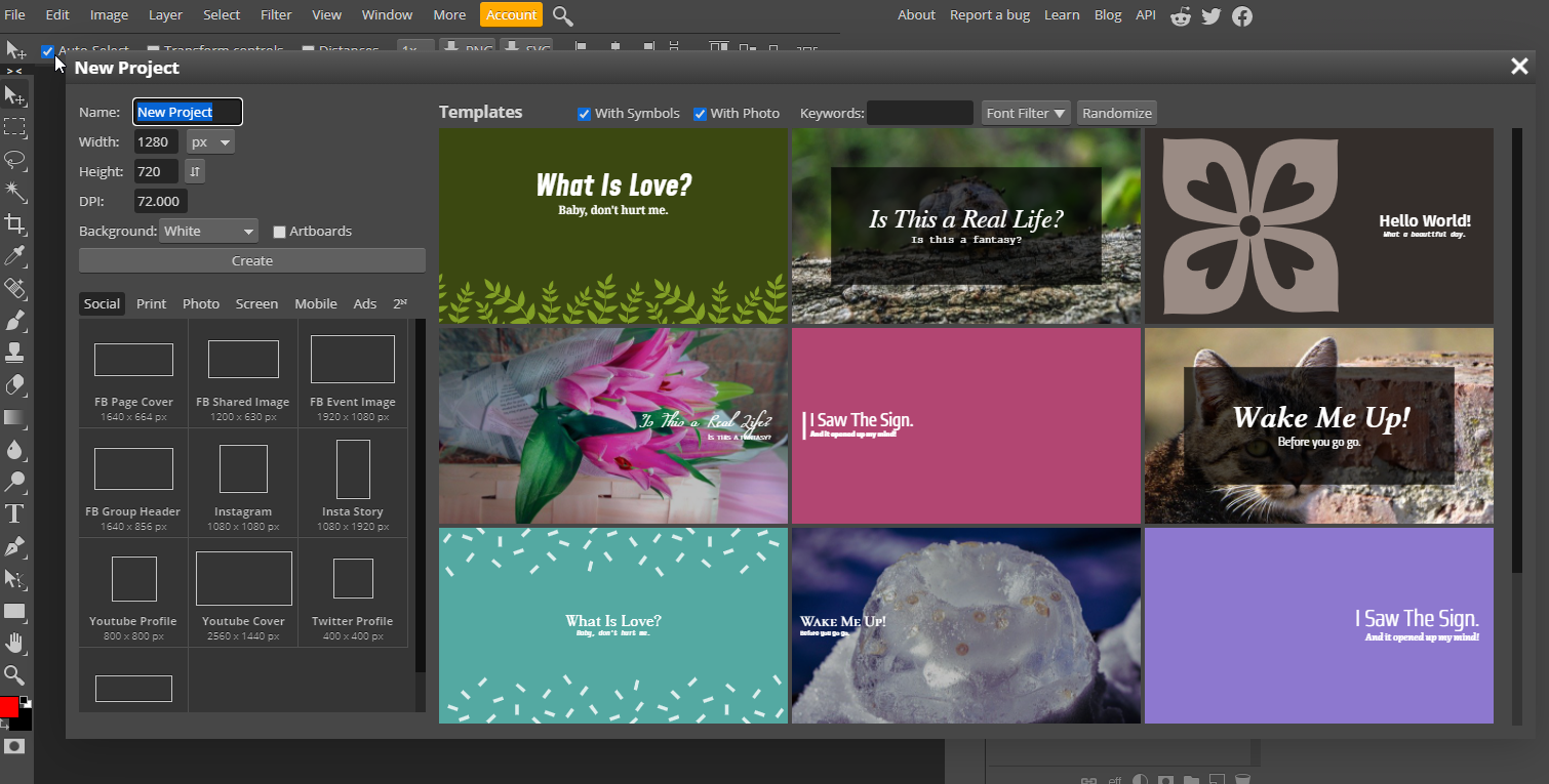 새 프로젝트를 누르면 사용할 최초 화면이 나옵니다. 제가 직접 사용을 사용을 해보니 디폴트 파일도 조금 있어 처음 사용할 때는 조금 편한거 같으나 포토샵의 기초지식 정도는 알고 있어야 편집하고 원하는 디자인 결과물을 만들어 내는 도움이 될 거 같습니다. 하지만 포토샵을 처음 접하시는 분 입장에서는 이 정도로 기본 파일 있는 것만으로도 엄청난 도움이 될 거니 유용하게 사용하실 수 있을 겁니다.