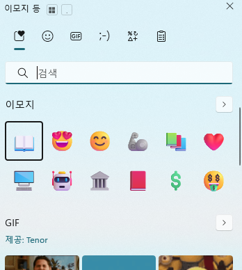 단축키를 누르면 화면 우측 하단에 이모지 패널이 뜨며, 다양한 이모티콘을 한눈에 선택할 수 있어요.