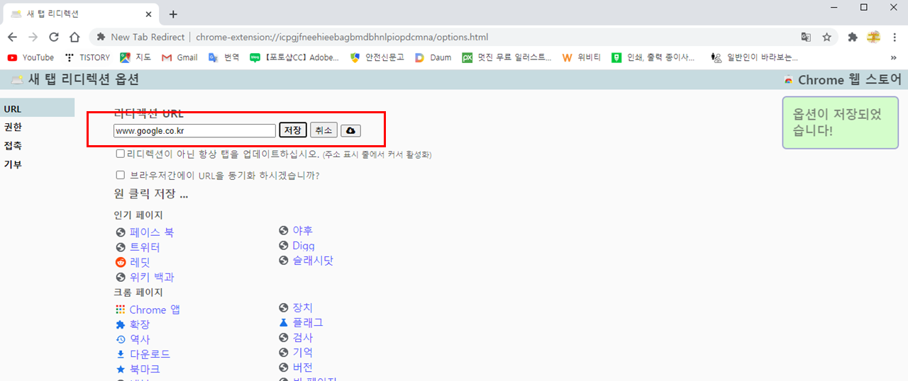 New Tab Redirect! 를 누르면 리다이렉트 할 사이트를 넣으라는 화면이 나온다.