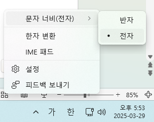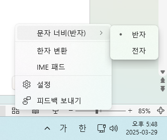 옆에 (가)라고 되어있는 부분에 마우스 오른쪽 클릭해보면 전자라고 되어있습니다. 이것을 반자로 바꿔주시면 해결됩니다.